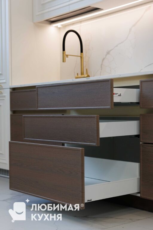 Нижние шкафы выполнены в оттенке темного дерева, что создаёт стильный контраст и балансирует классический верх современным низом. Лаконичные горизонтальные ручки поддерживают минималистичный настрой. Фартук и столешница с выразительной, но ненавязчивой текстурой светлого мрамора, объединяя всю композицию.